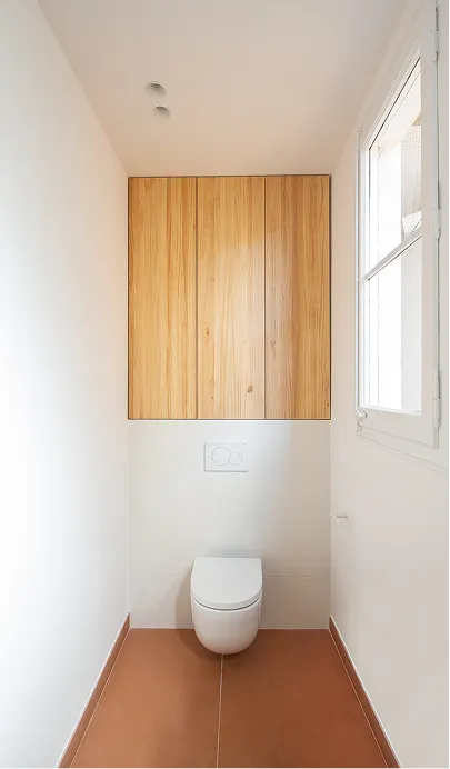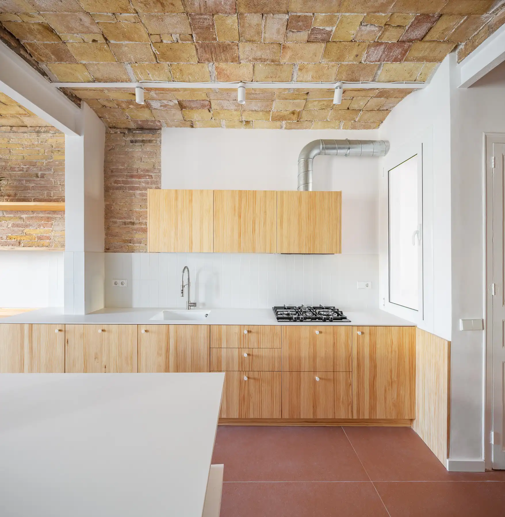 Queríamos una casa donde la luz llegara a todos los rincones. Abrimos estancias hacia este objetivo y jugamos con la materialidad: el pino y el color terracota nos evocan ese frescor mediterráneo que tanto recuerda a Marc.