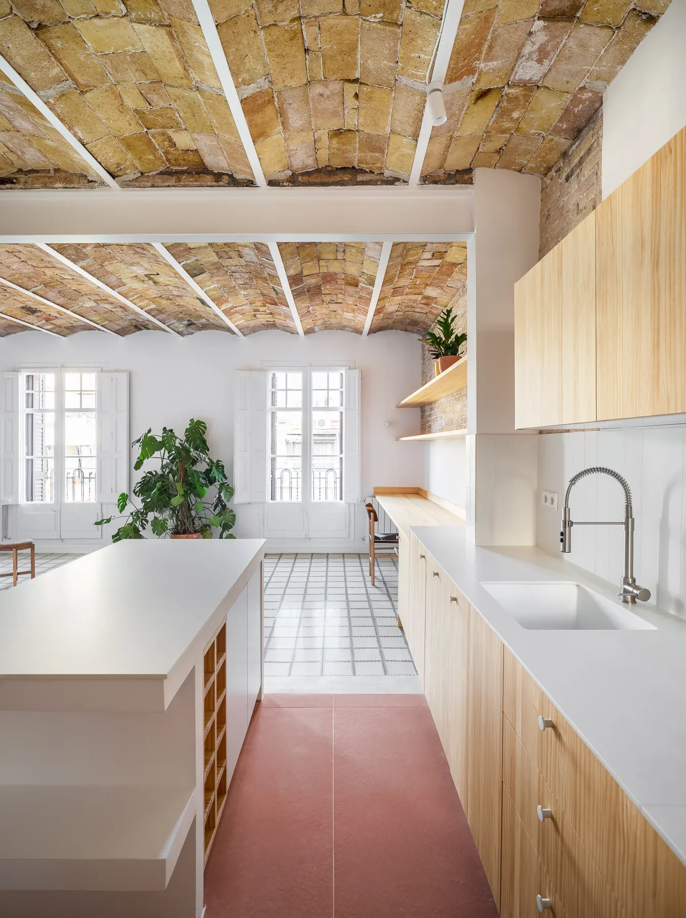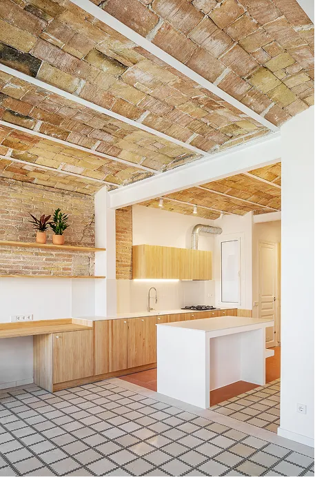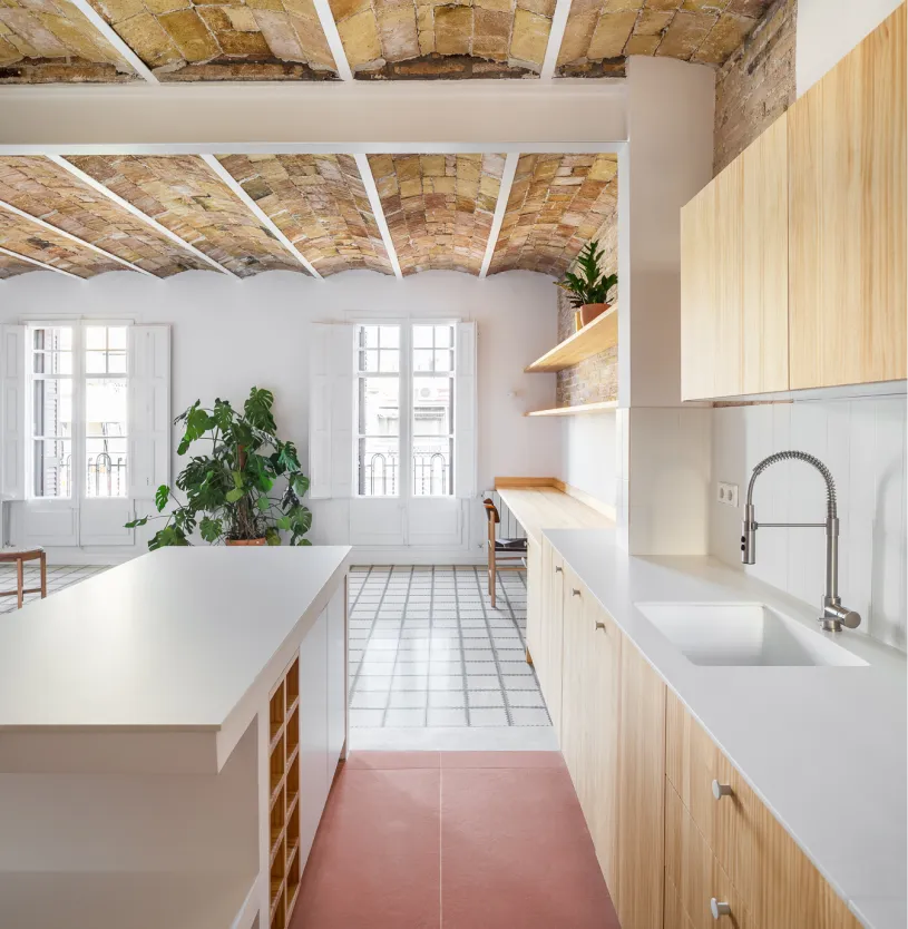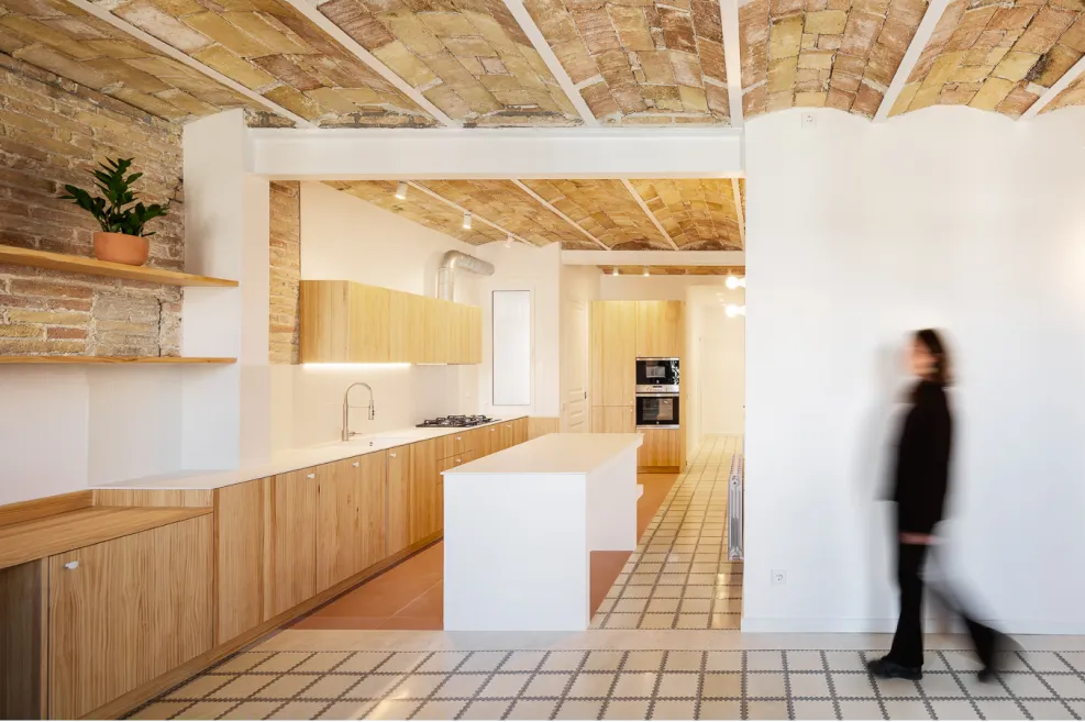 En “Al buen vino” , la premisa fue diseñar para vivir sin complicaciones. Por eso, el primer gran gesto fue un apeo estructural que permitió convertir la cocina en el centro social. Construimos una isla como nexo, perfecta para cocinar y atender invitados a la vez.