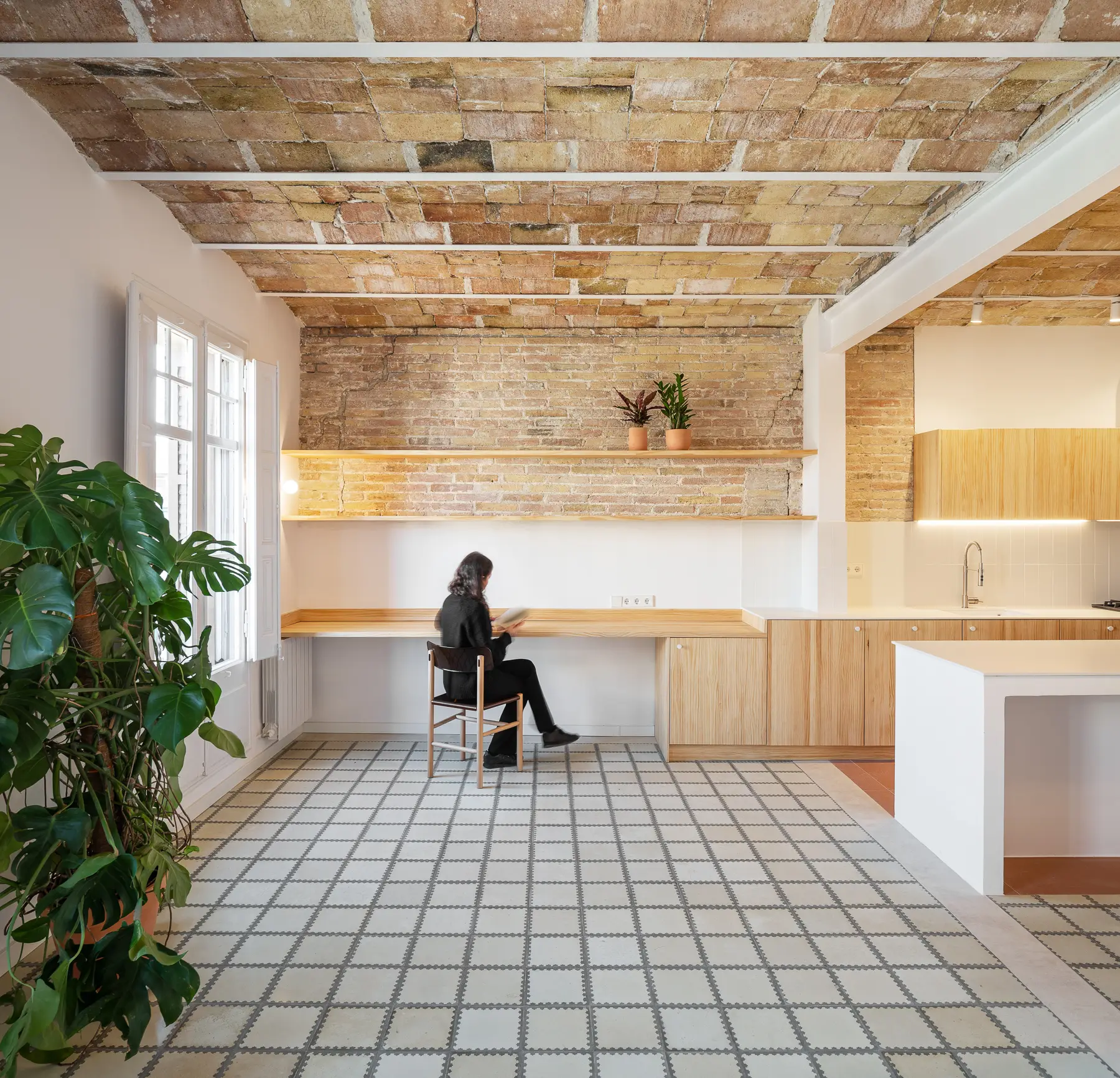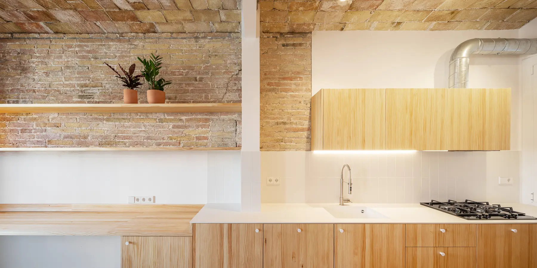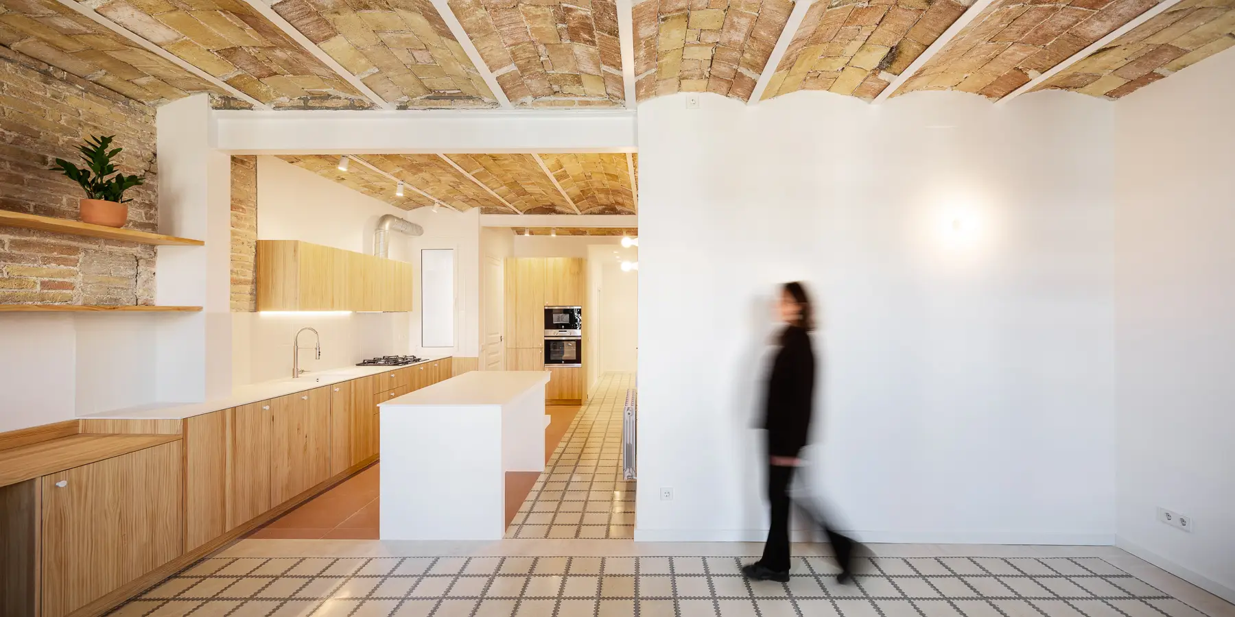 En “Al buen vino” , la premisa fue diseñar para vivir sin complicaciones. Por eso, el primer gran gesto fue un apeo estructural que permitió convertir la cocina en el centro social. Construimos una isla como nexo, perfecta para cocinar y atender invitados a la vez.