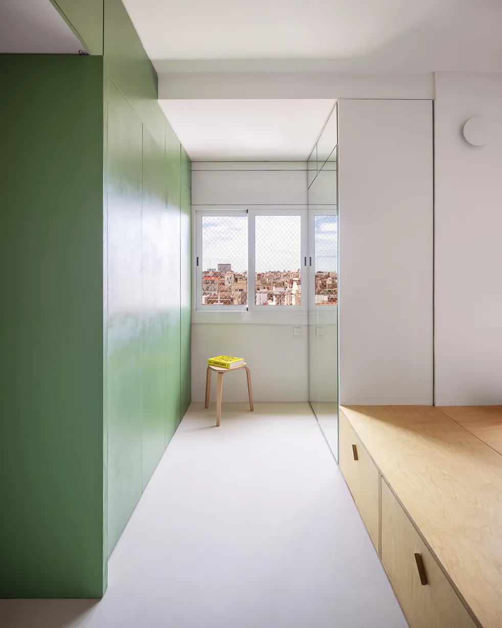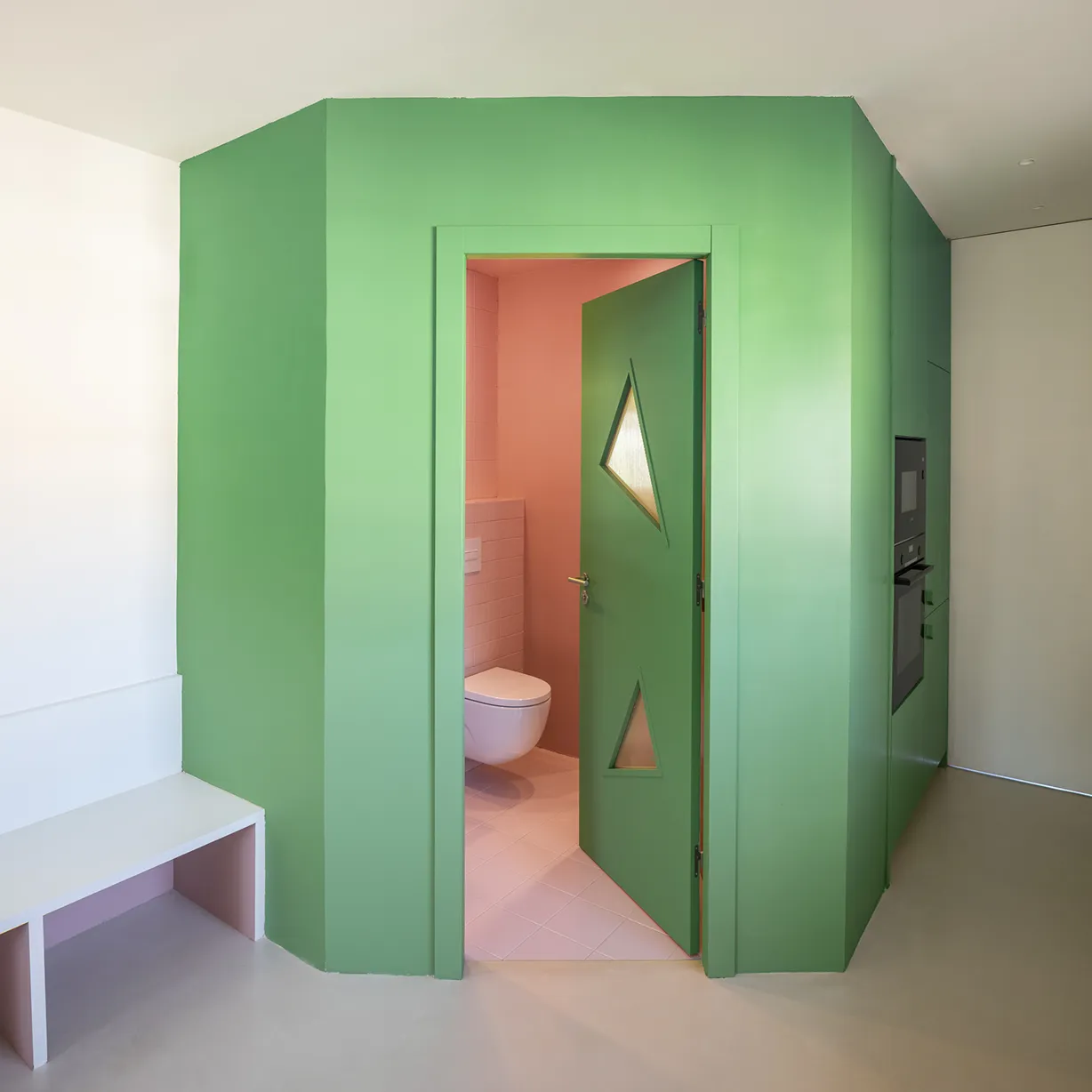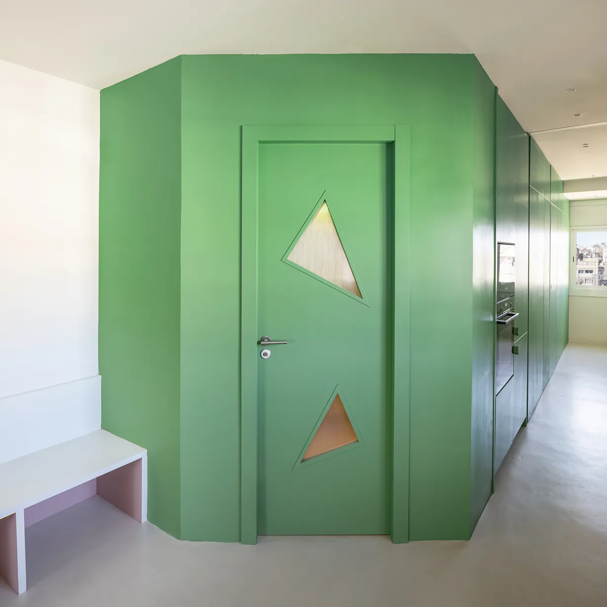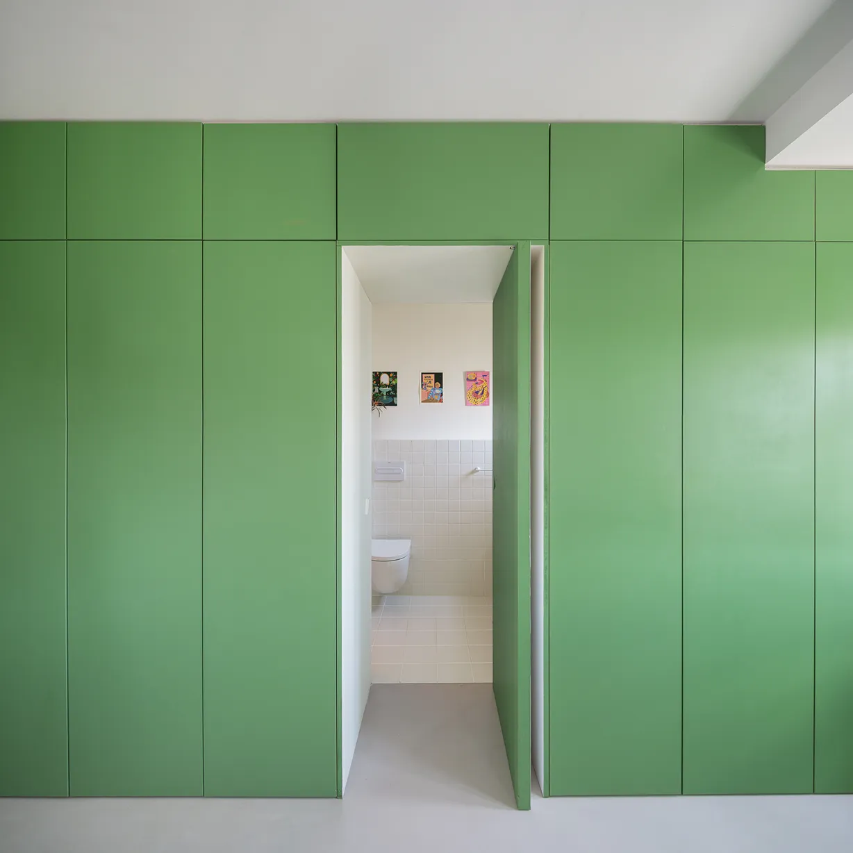 El volumen verde como truco de contraste. El gesto del proyecto fue unir geometría y función: un volumen central verde con los baños separa los espacios y crea un filtro visual y funcional.