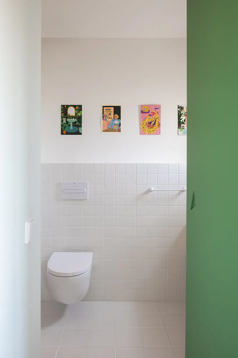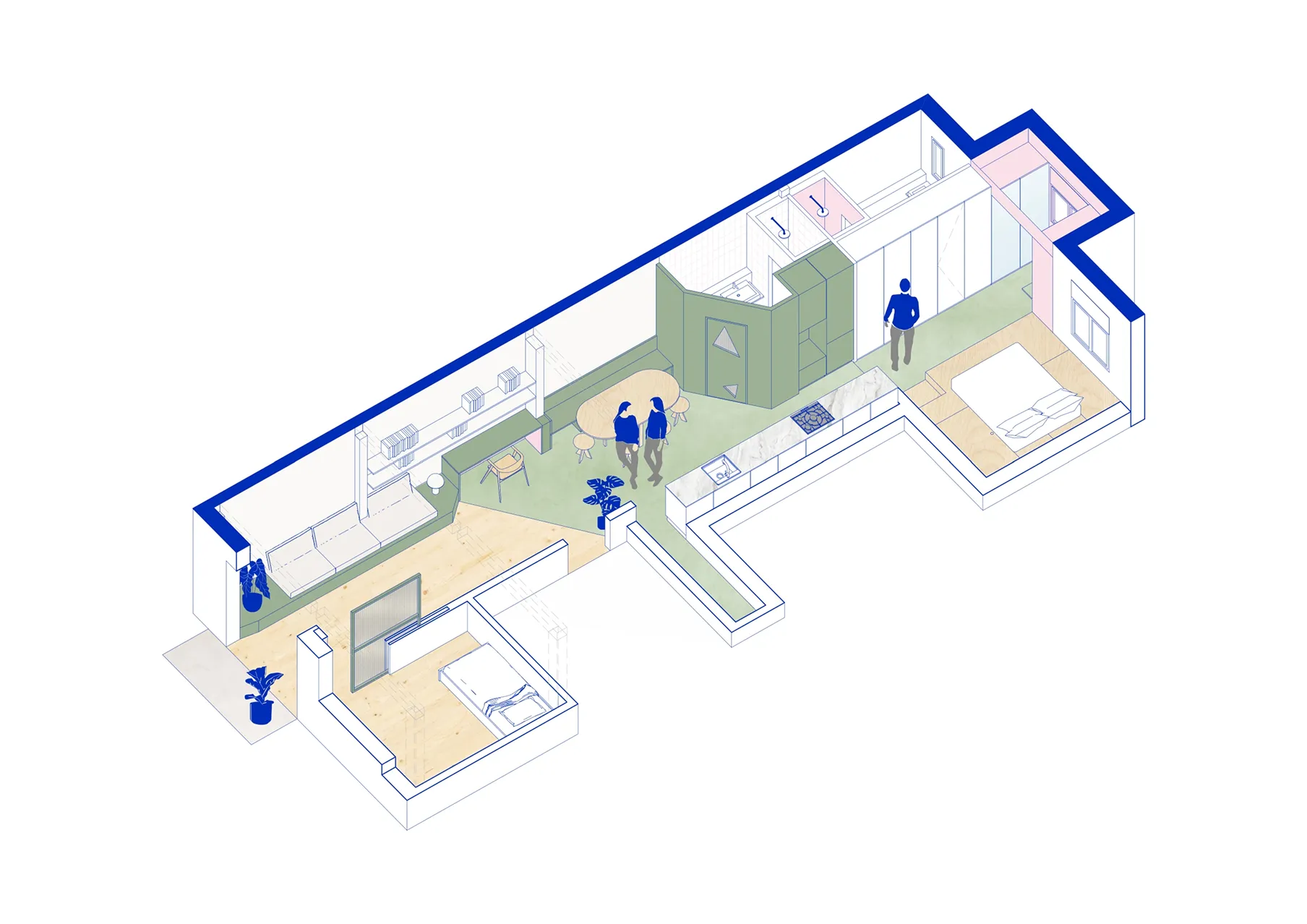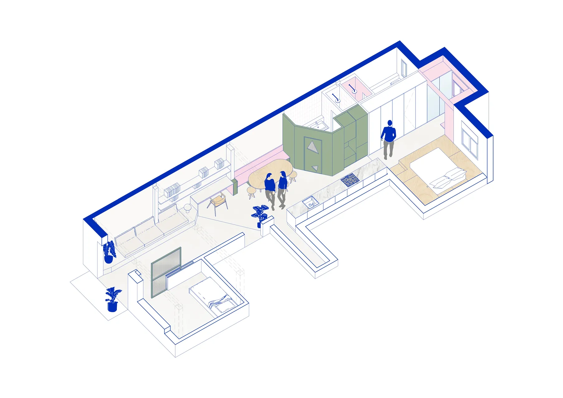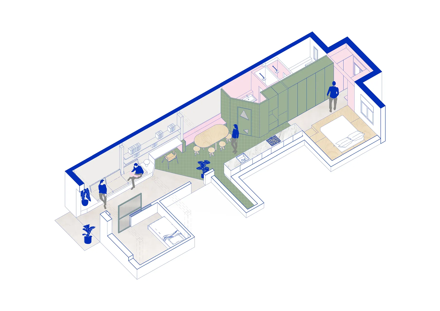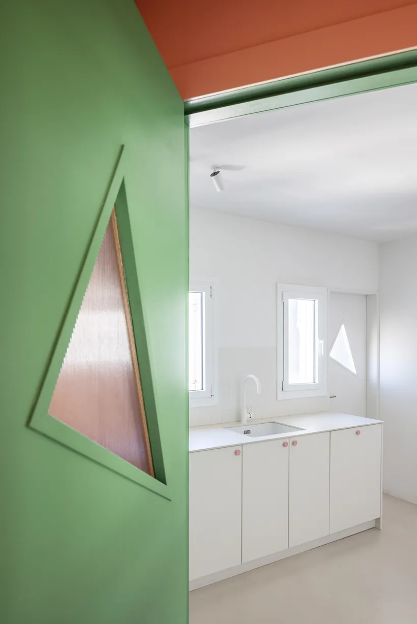 El volumen verde como truco de contraste. El gesto del proyecto fue unir geometría y función: un volumen central verde con los baños separa los espacios y crea un filtro visual y funcional.