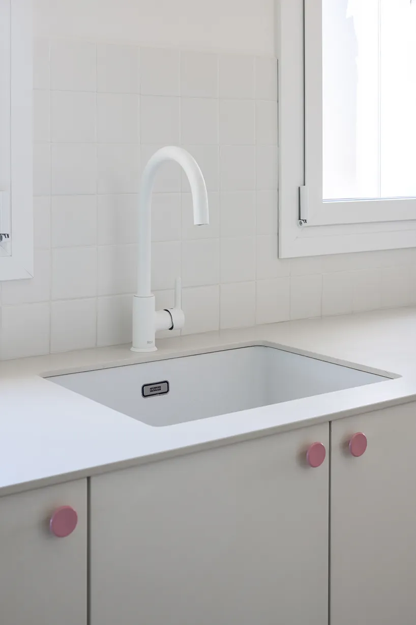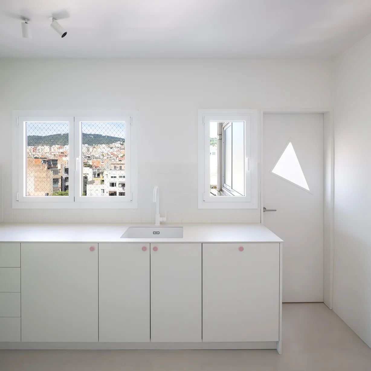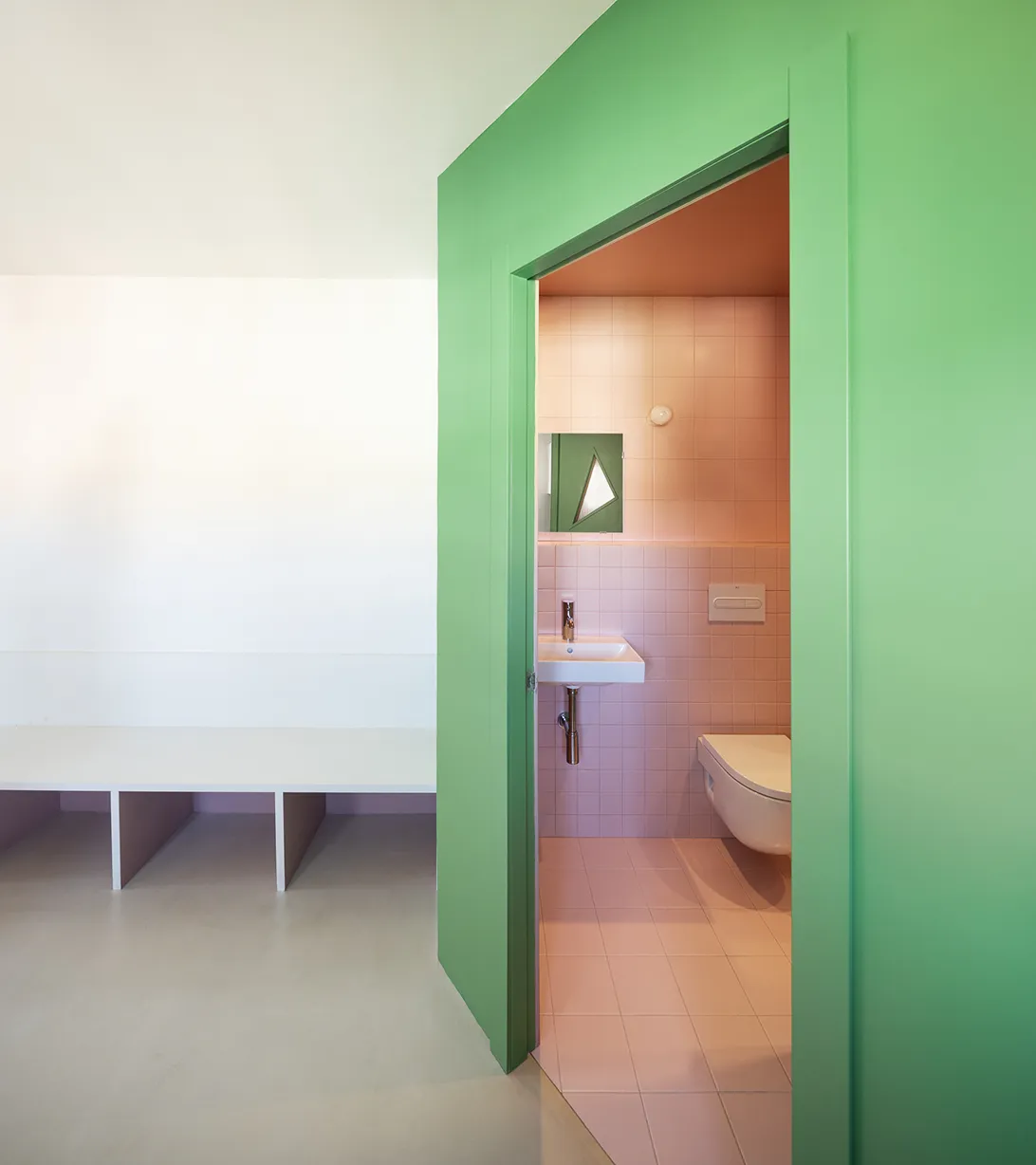 Dentro, el juego es lúdico: dos baños con diseño invertido. Uno se envuelve en rosa, con la ducha como una cueva blanca, y el otro a la inversa. La gatera es el detalle en un diseño para toda la familia.